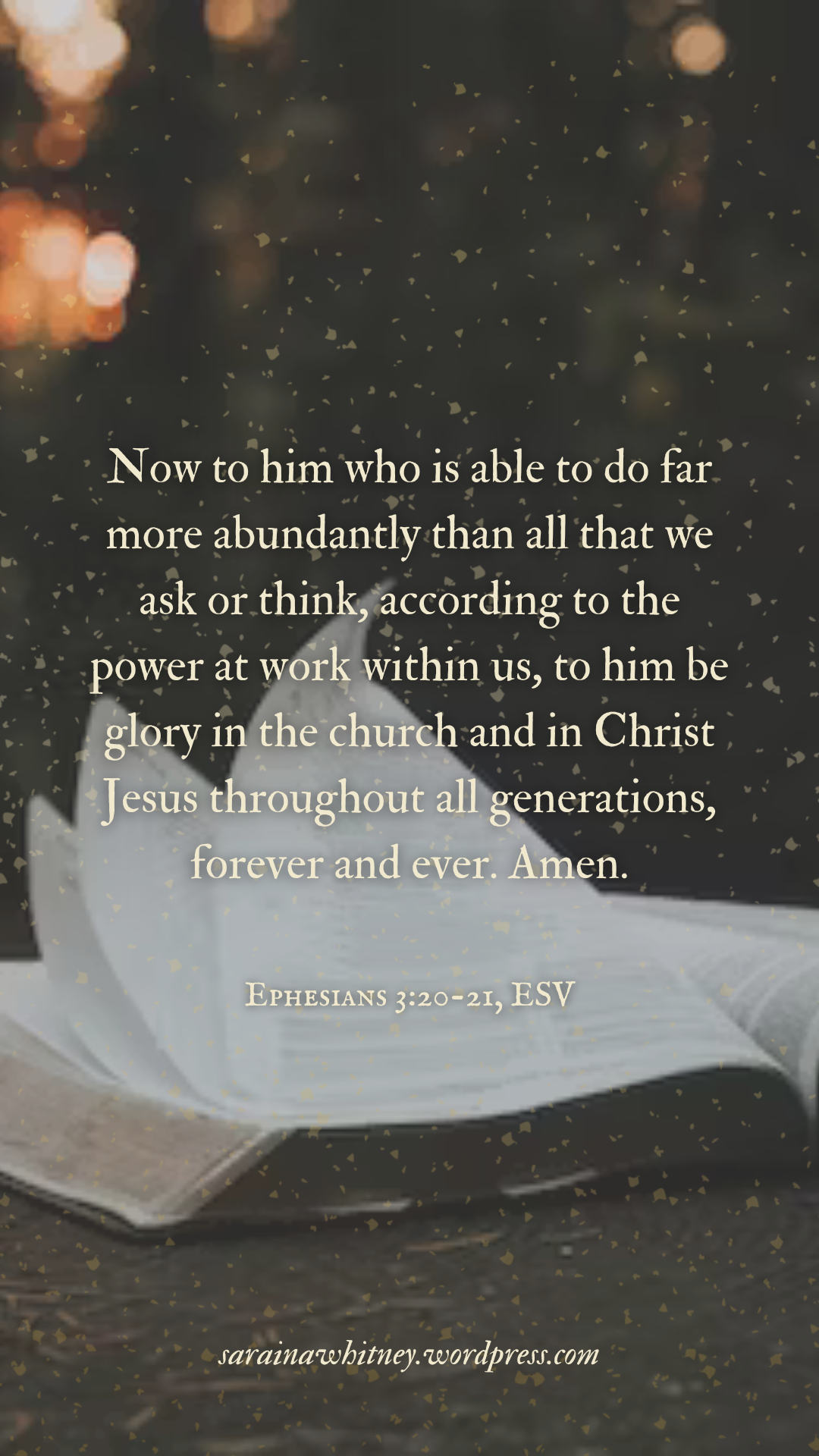 Now to him who is able to do far more abundantly than all that we ask or think, according to the power at work within us, to him be glory in the church and in Christ Jesus throughout all generations, forever and ever. Amen.