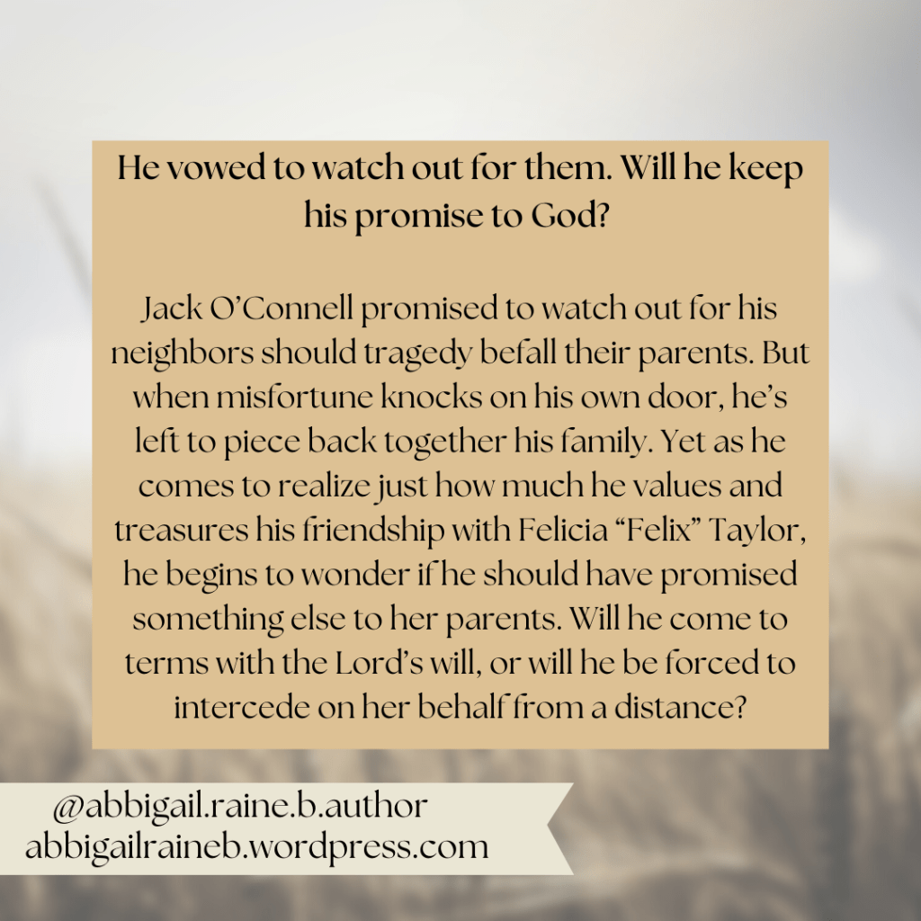 Jack O’Connell promised to watch out for his neighbors should tragedy befall their parents. But when misfortune knocks on his own door, he’s left to piece back together his family. Yet as he comes to realize just how much he values and treasures his friendship with Felicia “Felix” Taylor, he begins to wonder if he should have promised something else to her parents. Will he come to terms with the Lord’s will, or will he be forced to intercede on her behalf from a distance?