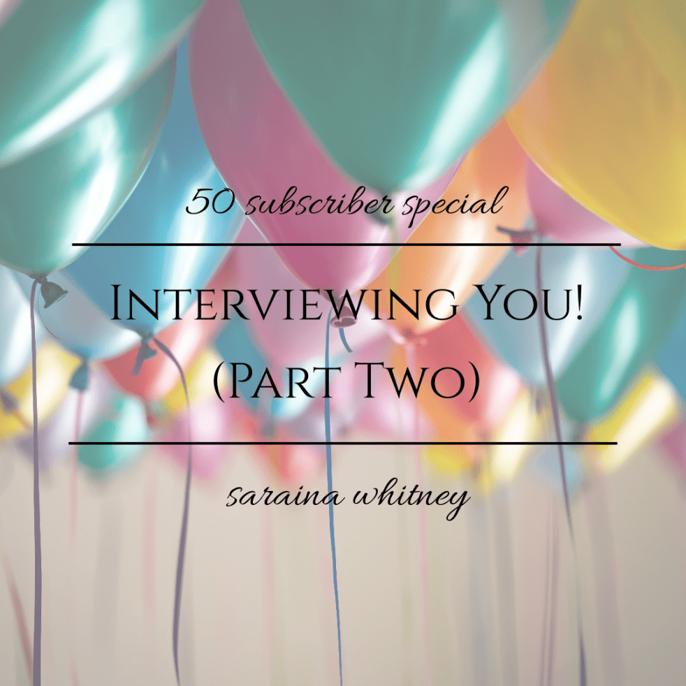 Here's Part 2 of the subscriber interview!!! ๐ (Jump over here for Part 1!) The questions answered are: "What time of day (or night) are you most creative?" "What fictional book has given you the most hope, or most impacted your life?" "What's a misconception you once had about writing?" and "What book do you… Continue reading 50 Subscriber Special: Interviewing You, Part 2!