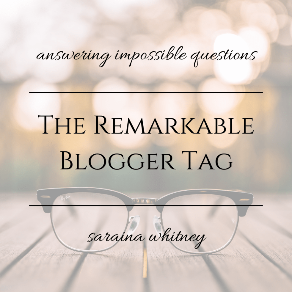 E. G. Bella and Grace A. Johnson tagged me several months ago, and Victoria just did at Bookworm Hollow, so I decided it was high time to give this tag a go! 😉 All three sets of questions are very fun, so let's see how I do answering them... (Also you have to read this… Continue reading The Remarkable Blogger Tag! (answering impossible questions)